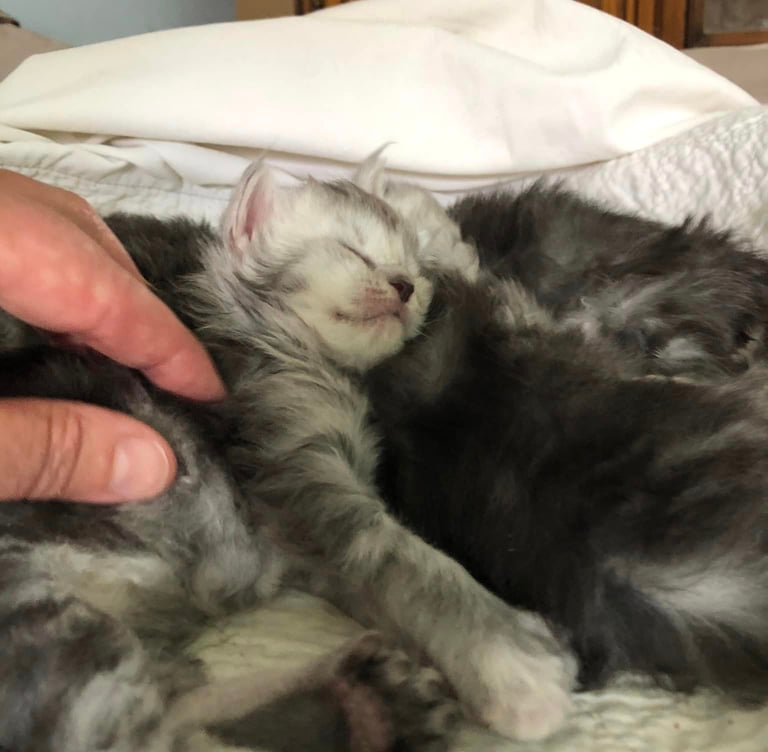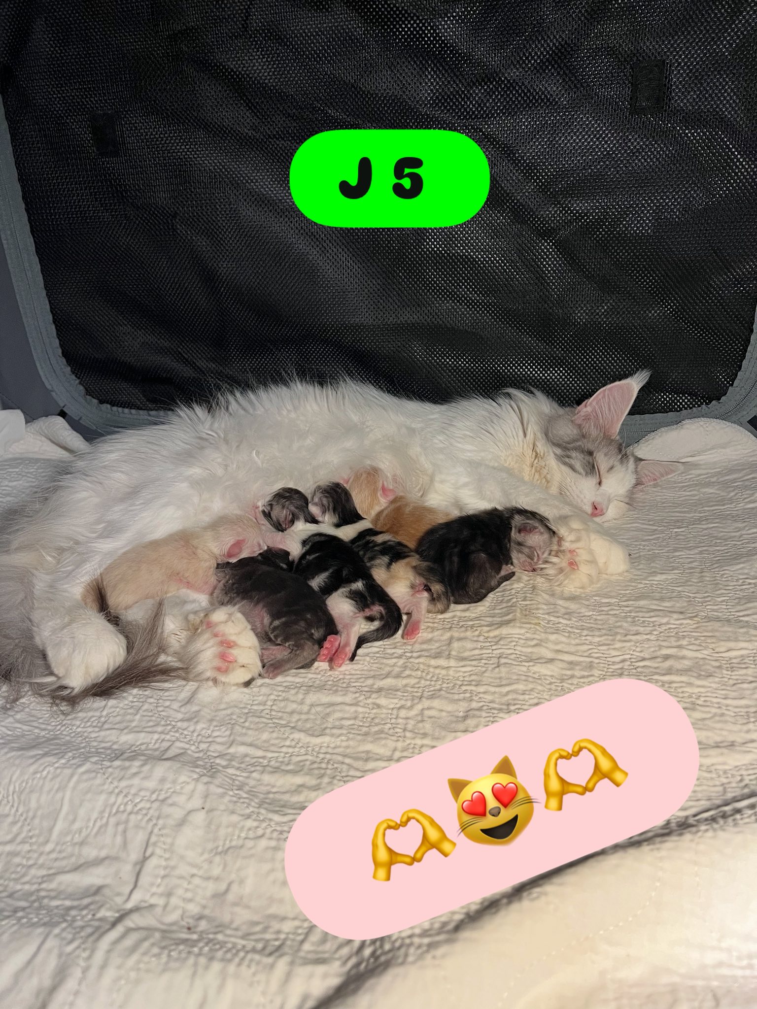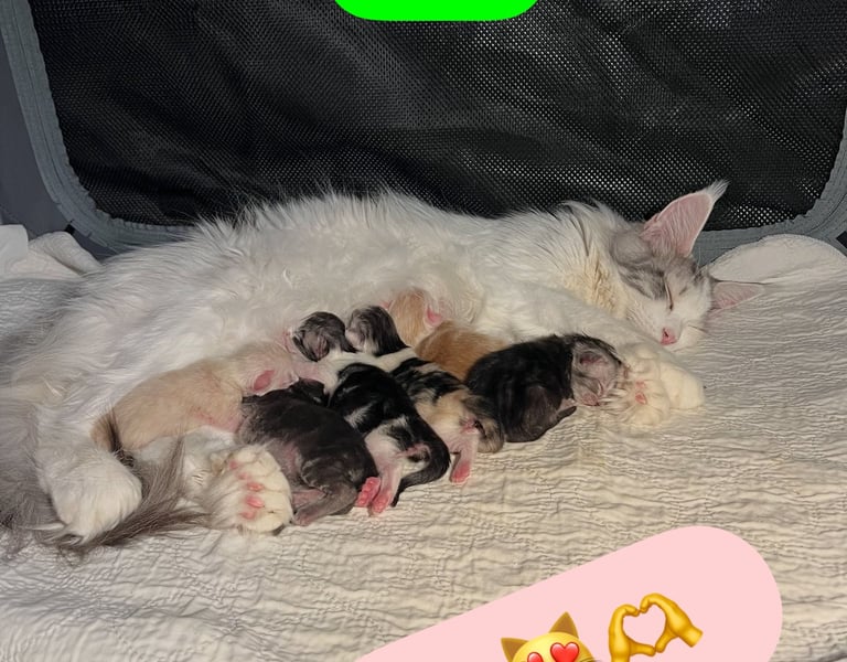 6 minicoonies sont arrivés le 15 janvier 2025, la mise bas s'est bien passée, le travail a duré 24h, Usabella a bien géré, même si elle était un peu stresséé.