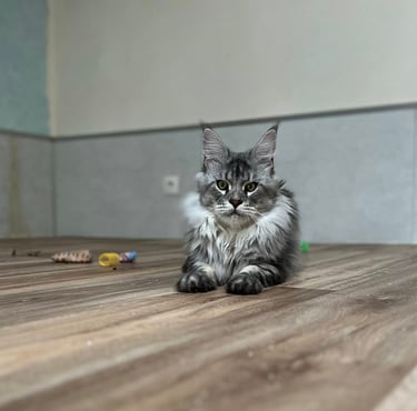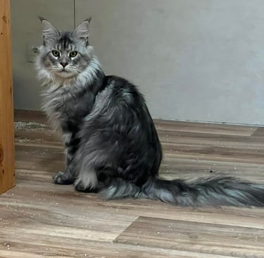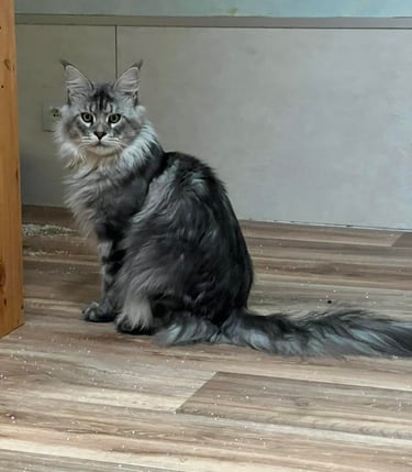 Uros So'Occimoon est un chaton de 5 mois qui pèse presque 5 kg. Il est toujours aussi adorable et gentil, ce qui fait de moi une grande fan. Cependant, il devient complètement fou dès qu'il voit un plumeau ou son jouet (ressort). Il grogne tellement fort que cela peut parfois faire peur, mais heureusement il ne fait que grogner. Il devient de plus en plus beau au fil du temps et j'ai vraiment hâte de le voir devenir papa avec mes filles.