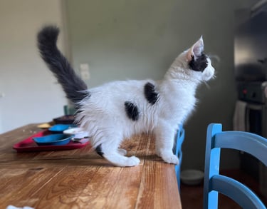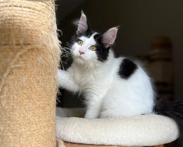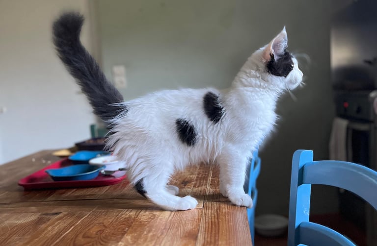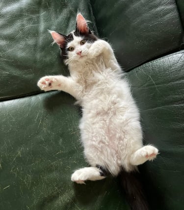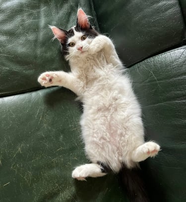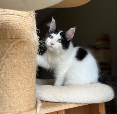 né le 18 juin 2025, noir arlequin et porteur du gène Récessif Blue Eyes Yeux bleus ou vairons : RBE, autorisé par le loof. Je rentre officiellement dans le programme Sky Eyes - maine coon arlequin, van - yeux vairons/odd eyed. Je ne remercierai jamais assez Aurélia et Alixia; 2 éleveuses qui me font confiance.