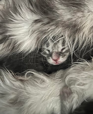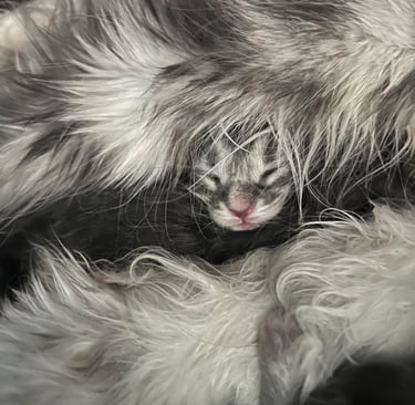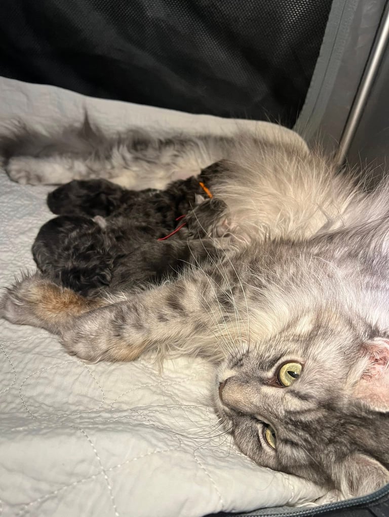 6 minicoonies sont arrivés le 15 janvier 2025, la mise bas s'est bien passée, le travail a duré 24h, Usabella a bien géré, même si elle était un peu stresséé.